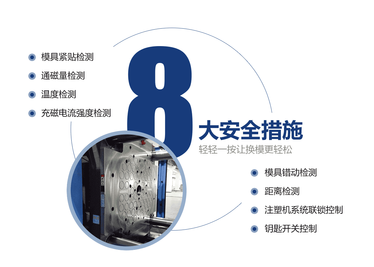 • 電永磁磁力模板大大提高注塑機(jī)換模效率。 自動化注塑機(jī)的換模方法僅需3分鐘即可完成。特大型注塑機(jī)模板的換模時間從超過2小時減少到10分鐘。